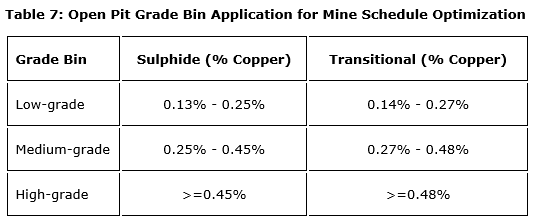 Grade bins were established to aid in mine planning, including low-grade, medium-grade and high-grade bins. Low-grade material reports to stockpiles unless available throughput allows direct feed to the mill in that period. The grade bins are defined by per cent copper for sulphide and transitional material.