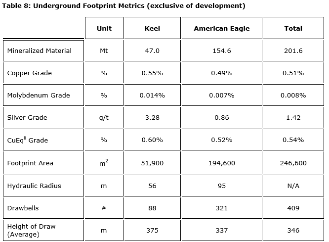 The Keel and American Eagle block cave footprints and production schedule were generated using Geovia's footprint finder software, an industry standard for cave optimization and scheduling, using the resource model. The economic assumptions applied in the footprint finder optimization were maintained as per the resource constraints as part of the reasonable prospects for eventual economic extraction (RPEEE) process, except for the maximum height of cave draw being set to 500 metres. The footprint finder outcome was then manually optimized to prioritize the higher-grade cave blocks whilst targeting the most practical footprint geometry for sequencing and productive capacity. This exercise culminated in a PEA underground mill feed inventory of 211 Mt.