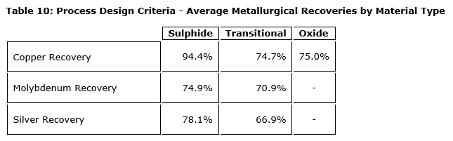 The simplified process flow sheet was developed based on recovery methods required for processing mineralized materials, and is supported by preliminary current and historical testwork, as well as financial evaluations. It includes a copper-molybdenum concentrator for sulphide and transitional minerals and a heap leach with SXEW operation for oxide minerals. The concentrator is designed to process, on average, 30,000 tpd (11 mtpy) of mineralized material.
