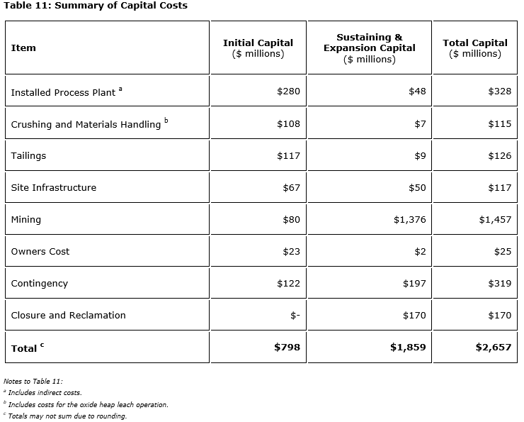 Initial capital costs are estimated to be $798-million, and sustaining/expansion capital costs are estimated at $1,859-million for a total LOM capital cost of $2,657-million. Expansion capital is associated with the process plant addition of a molybdenum circuit in year three and bringing the underground block cave into production.