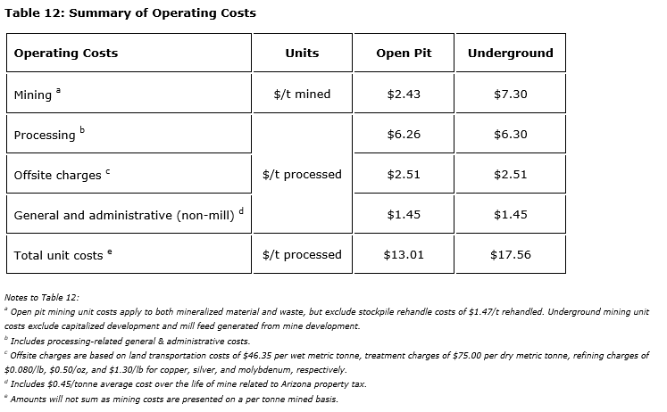 G&A cost of $1.45 per tonne processed (exclusive of process-plant-related G&A) is composed of $1 per t processed based on regional benchmarks of comparative operational scale, plus 45 cents per t processed average over the life of mine related to Arizona property tax. The project would not require a camp facility as the location is easily accessible from the townsites of Mammoth, San Manuel and Oracle, as well as being approximately 80 road km northeast from the city of Tucson.
