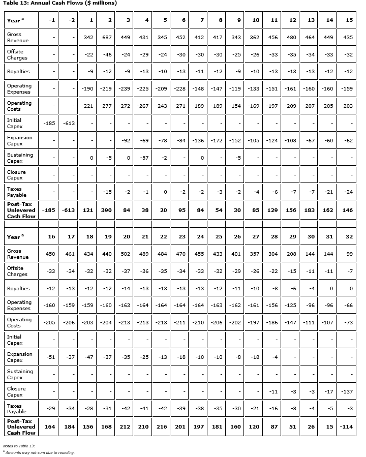 A detailed breakdown of annual cash flows over the life of mine is provided herein.