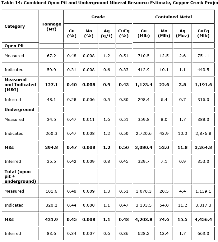Zach Allwright, vice-president, projects and evaluations, stated: "The outcome of the PEA demonstrates the potential for Copper Creek to become a significant source of U.S. domestic copper production. The study is underpinned by empirical data, acquired through extensive geological and geotechnical assessments, comprehensive metallurgical testwork, first principles costing, and diligent schedule optimization. This base case forms a foundation on which the company can continue to add value through resource expansion, new discoveries on the property, the potential to add a gold byproduct and various opportunities to increase the production capacity."
