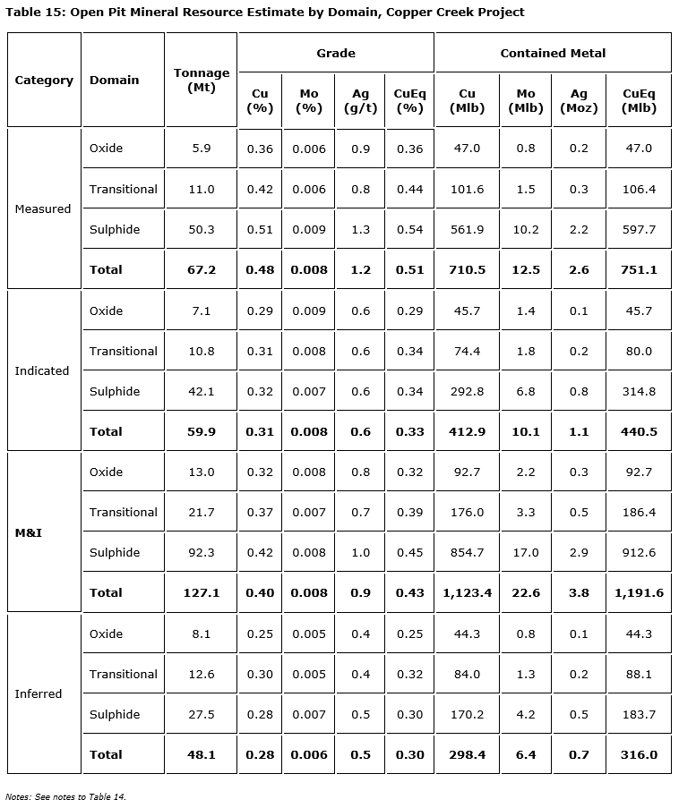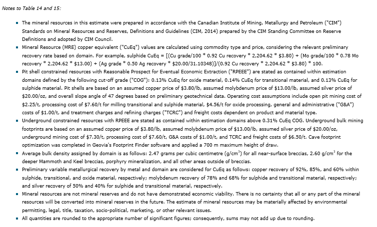 - Updated mineral resource estimate: an updated MRE is the basis for the PEA; measured and indicated resources are 421.9 million tonnes at an average grade of 0.45 per cent copper for a contained 4.2 billion pounds of copper;