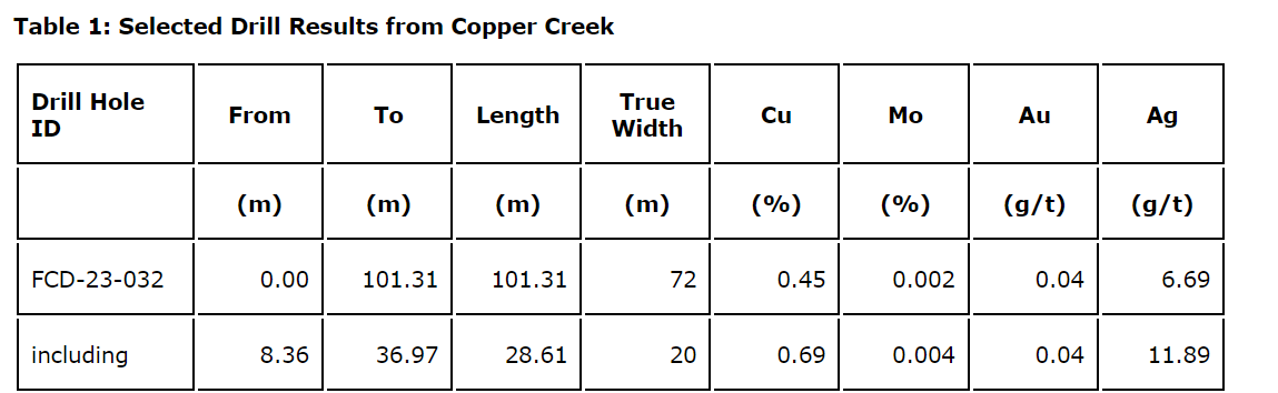 - Intersected 101.31 metres at 0.45 per cent copper and 6.69 grams per tonne silver from surface, including 17.70 m at 0.96 per cent copper, 3.33 g/t silver and 0.12 g/t gold, from 68.16 m in drill hole FCD-23-032 at the Pole breccia;