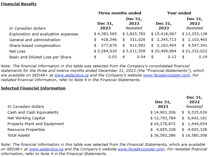 FARADAY COPPER REPORTS 2023 FINANCIAL RESULTS