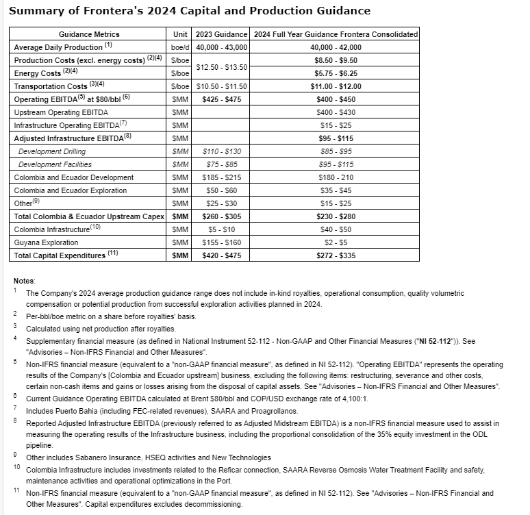 Frontera's 2024 capital and production guidance is based on an average 2024 Brent price of $80/bbl, an average sales price oil differential of $4.50/bbl and an exchange rate of 4,100 Colombian pesos per U.S. dollar.