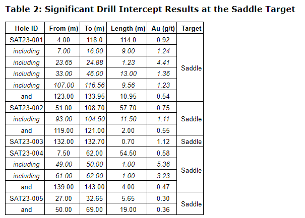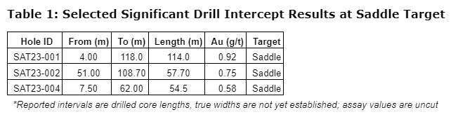 The results from the 2023 winter drilling highlight robust intervals of consistent gold mineralization over significant widths, and have identified key pathfinder elements in association with the gold mineralization. The program has been successful in confirming the continuation of the mineralization envelope along the shear structure, opening up the exploration growth potential around the Saddle target.
