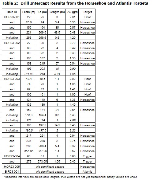 First drilling by the company at the Horseshoe target included five drill holes totalling 1,589 metres which identified a significant gold mineralization system, with drill highlights including 0.48 gram per tonne Au over 48.5 metres in drill hole HOR23-001, 0.54 g/t Au over 57 metres in drill hole HOR23-002, and 0.64 g/t Au over 24 metres and 0.45 g/t Au over 14.5 metres in drill hole HOR23-003. The company also completed drilling at the Atlantis target which focused on EM plate modelled targets identified in the 2022 airborne geophysics campaign.