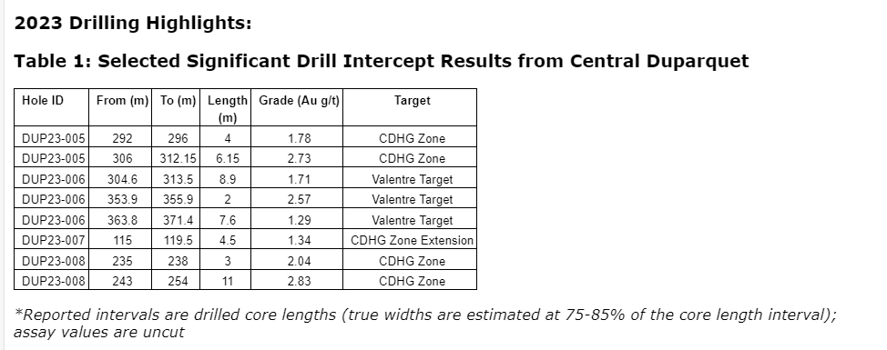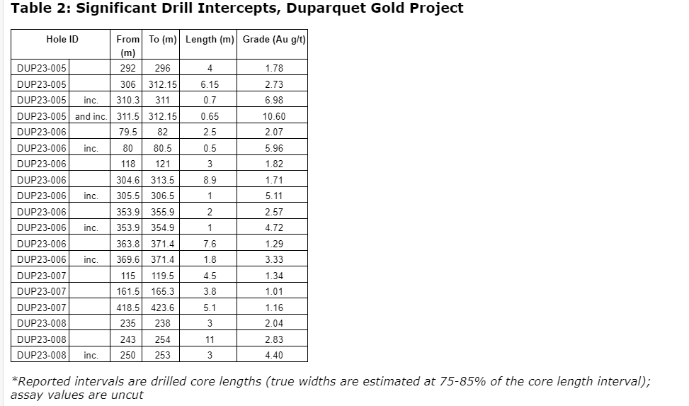 In addition, drilling at the CDHG zone in the area of the historical Central Duparquet development returned 1.78 g/t Au over four m, 2.73 g/t Au over 6.15 m, including 6.98 g/t Au over 0.7 m, and including 10.6 g/t Au over 0.65 m, in drill hole DUP23-005. These results validate the resource wireframe and support the extension of a higher-grade zone with mineralization continuity at depth.