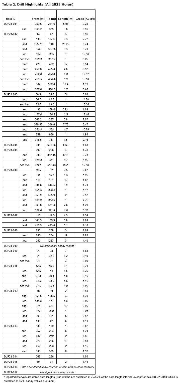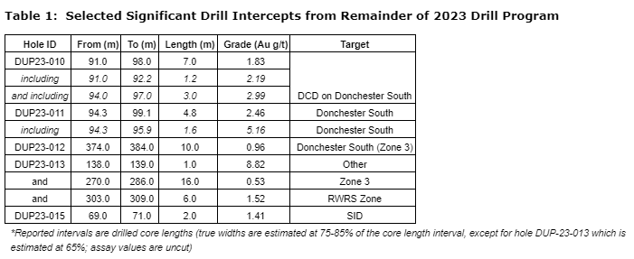 Other significant intersections from the latest drilling include 2.7 g/t Au over 3.4 m and 2.46 g/t Au over 4.8 m, including 5.16 g/t Au over 1.6 m in drill hole DUP23-011, as well as 0.96 g/t Au over 10.0 m and 1.1 g/t Au over 6.0 m in drill hole DUP23-012 (Table 2 and Figure 3). The near-surface results from DUP23-011 confirm the up-dip extension of the historically mined Donchester South Zone. The assays returned support further investigation of opportunities to add additional ounces (defining new wireframes) as the intercepts are beyond the limits of the current PEA pit shell. Drill hole DUP23-012 confirms the continuity at depth of the Zone 3 wireframe.
