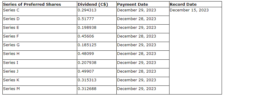 Fairfax has also determined the quarterly dividend rates in respect of the Dec. 29, 2023, to March 27, 2024, dividend period for its other floating rate preferred shares. The rates, together with the dividends per share payable for such period (if and when declared), are set forth in the attached table.