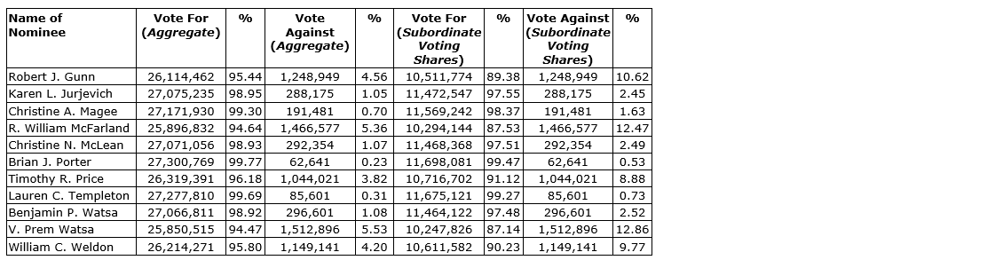 Fairfax Financial Holdings Ltd. has released the results of the vote on directors at its April 16, 2026, annual shareholders meeting.