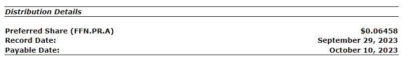 There will not be a distribution paid to the Class A shares for Sept. 29, 2023, as per the prospectus which states no regular monthly dividends will be paid on the Class A shares in any month as long as the net asset value per unit is equal to or less than $15.00.