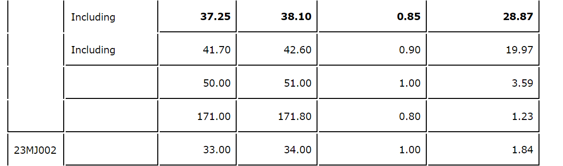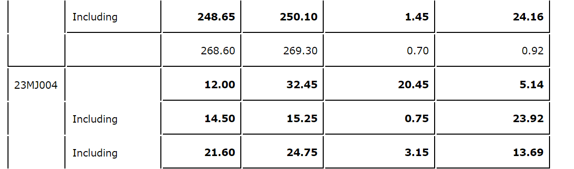 At approximately the same depth as previously drilled in the area, 22MJ003 confirmed a significant, deep, high-grade zone of gold mineralization. This interval was 2.45 m averaging 15.22 g/t Au, including 1.45 m at 24.16 g/t Au, from 248.65 metres deep. The high-grade zone is hosted in quartz-albite fault breccia (possible hydrothermal breccia) with disseminated pyrite mineralization and associated quartz-tourmaline and tourmaline veinlets. In total, drill hole 23MJ003 intersected 14 individual mineralized intervals above the cut-off grade of 0.5 g/t Au.
