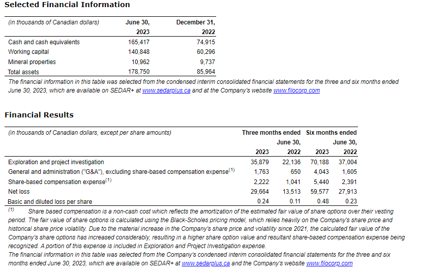 Filo Corp. has released its results for the three and six months ended June 30, 2023.