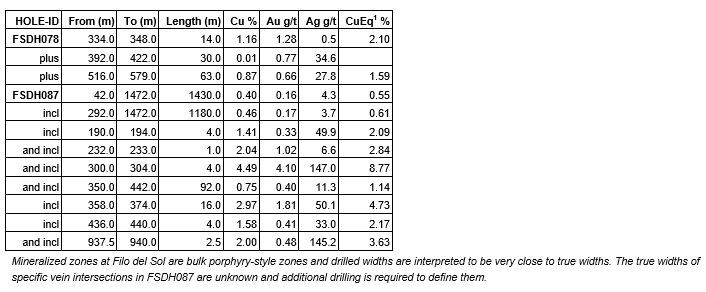 Filo Corp. has released assay results from holes FSDH078 testing the Aurora zone, and FSDH087 testing the 1.3-kilometre gap between the Aurora and Bonita zones at the Filo del Sol project in San Juan, Argentina. Highlights and detailed results are shown herein.