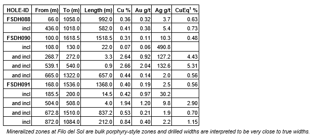 Filo Corp. has released assay results from holes FSDH088, FSDH090 and FSDH091 from the Filo del Sol project in San Juan, Argentina. Highlights and detailed results are shown along with accompanying figures: