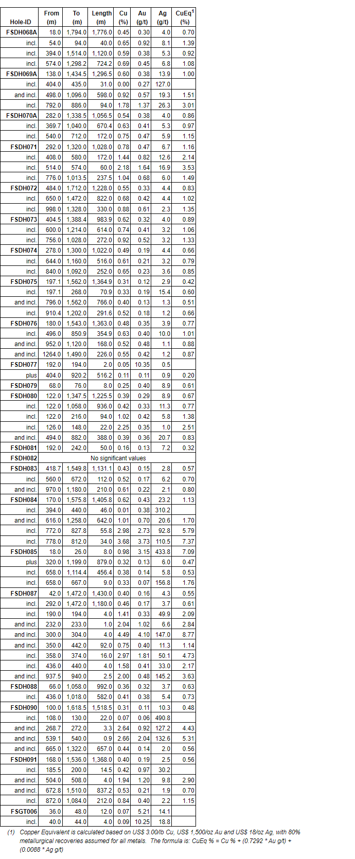 - Hole FSDH090, collared 730 metres to the south of FSDH091, intersected 1,518.5 m at 0.48 per cent CuEq and intersected a number of high-grade sulphide veins over the upper several hundred metres, similar to those seen in FSDH087. This includes a 22 m intersection of 490.8 grams per tonne silver which may correlate with a 16 m interval of 4.73 per cent CuEq (including 50g/t silver) 300 m away in FSDH087.