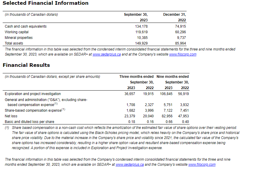 Filo Corp. has released its results for the three and nine months ended Sept. 30, 2023.