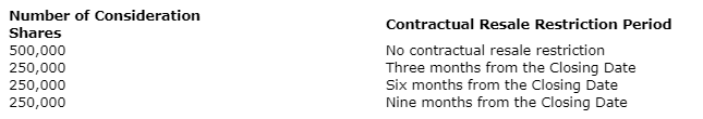 Under the terms of the proposed transaction, the company will acquire all of the shares of BB Gold Inc., a company existing under the laws of Newfoundland and Labrador, and its wholly owned Finnish subsidiary, Sisu Exploration Oy, the direct owner of the reservations, from a private individual (the vendor) in exchange for the issuance of 1.25 million common shares. In addition to any statutory resale restrictions, the consideration shares will be subject to the contractual resale restrictions noted herein.