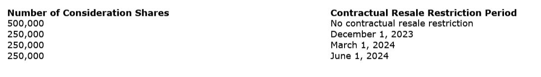 Pursuant to the Transaction, the Company has acquired all of the shares of BB Gold Inc., a company existing under the laws of Newfoundland and Labrador and its wholly owned Finnish subsidiary Sisu Exploration Oy, the direct owner of the Concessions, from a private individual (the "Vendor") in exchange for the issuance of 1,250,000 common shares (the "Consideration Shares"). The Consideration Shares are subject to the following contractual resale restrictions: