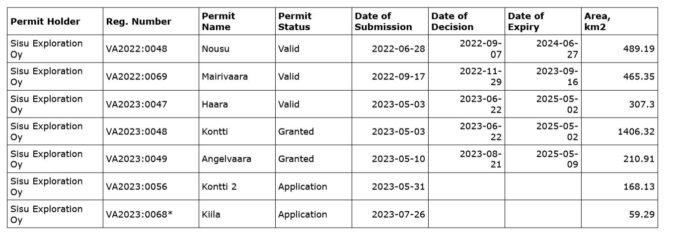 KiilaThis reservation is underlain primarily by meta-sedimentary rocks of the Pohjaanma Schist Belt which hosts the Kaustinen Li-Pegmatite cluster of deposits, currently under development and lies within 25 km of Keliber Oys Battery Metal Processing Plant in Kokkola, Finland. This reservation is contiguous with the Lappajarvi Reservation which is the subject of an agreement between the company and Capella Minerals Limited (See press release dated March 20, 2023). This reservation is considered prospective for battery and rare metals (Lithium, Cesium and Tantalum), and rare earth elements (Ytrium, Niobium and Fluorine) among others.