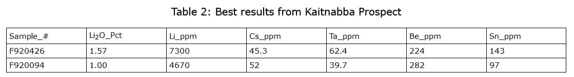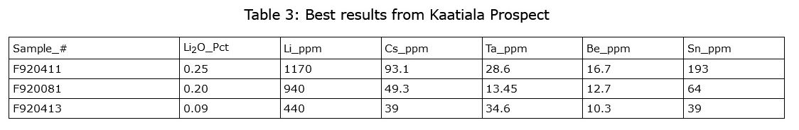 KyrolaThe most significant discovery during the Phase 1 program was the discovery of a 350 m long by 110 m wide Northwest-Southeast trending spodumene-bearing pegmatite boulder field on the Nabba Reservation. The extent of the boulder field is constrained only by low-lying overburden covered areas and farm fields. A total of forty-nine (49) rock chip grab samples were collected from the field and individual samples assayed from 0.003% to 3.84% Li2O . The mean assay of these samples was 0.53% Li2O . Fifteen samples assayed greater than 0.50% Li2O , eleven assayed greater than 1.00% Li2O , 4 assayed greater than 2.00% Li2O and 1 assayed greater than 3.00% Li2O . The boulders are generally angular and range in size from small hand size cobbles up to > 1.5 m in diameter. The boulders are also weakly anomalous in Cesium (Cs), Tantalum (Ta), Beryllium (Ta) and Tin (Sn).