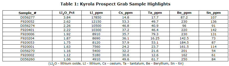 - 350-metre by 110 m spodumene-bearing boulder field discovery, where 49 rock chip grab samples ran from 3.84 per cent Li2O (lithium oxide) to 0.003 per cent Li2O, with 15 of the 49 samples returning grades in excess of 0.50 per cent Li2O.