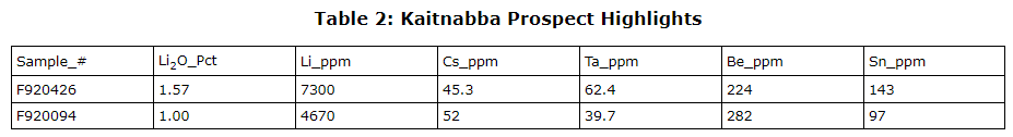 - Spodumene-bearing boulder cluster discovery, where two rock chip grab samples returned 1.57 per cent and 1.01 per cent Li2O.