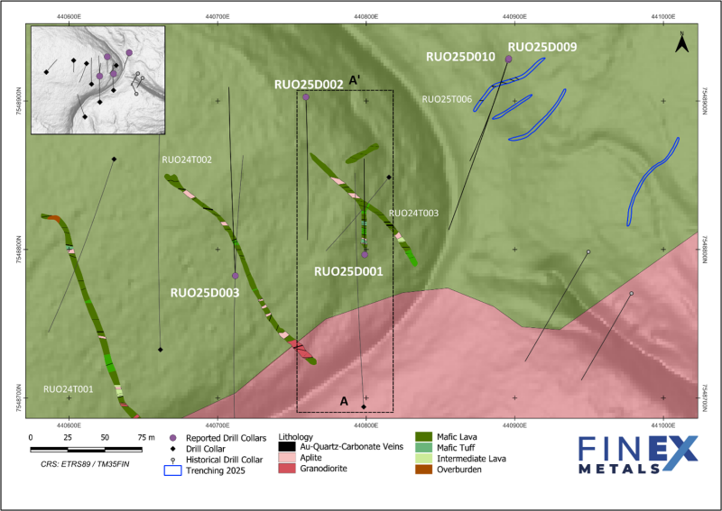 Drill holes were collared to intersect the mineralized quartz veins perpendicularly beneath the trenches at approximately 50 to 260 metres vertical depths.  Drill holes RUO25D001 and RUO25D002 targeted the mineralization present in trench RUO24T003 from opposite directions. Hole RUO25D003 was drilled beneath trench RUO24T002, while RUO25D009 and RUO25D010 targeted the thick quartz-carbonate veins identified in trench RUO25T006 ( Figure 3).  Lithologically, all five drill holes intersected similar massive, pillowed or hyaloclastic mafic volcanic rocks locally interbedded with mafic tuffs.  Thin, fine-grained granitic intrusive dykes (aplites) are common within the volcanic units.  Quartz-carbonate veins are abundant, generally between 5 to 100 centimetres wide with the most intensively veined intervals associated with pervasive biotite and carbonate alteration.
