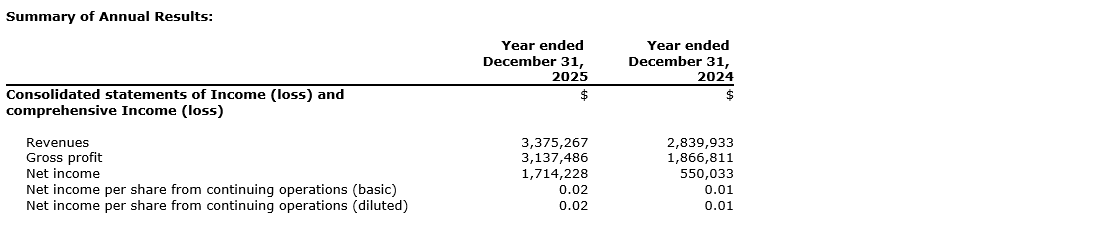- Total income of $1,714,228 for the year ended Dec. 31, 2025 (2024 -- $550,033);