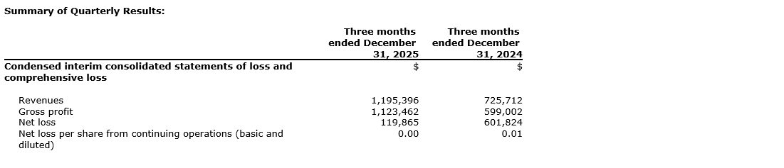 - Total revenues of $1,195,396 for the three months ended Dec. 31, 2025 (2024 -- $725,712);