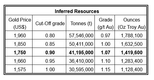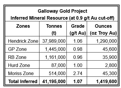 As outlined in the Technical Report and as reported in the Company's press release dated March 23, 2023, and filed on SEDAR on that date, using the potential underground bulk mining scenario with a 0.90 g/t Au cut-off grade, the Galloway gold project contains an estimated Inferred Mineral Resource of 41,195,000 tonnes grading 1.07 g/t Au for 1,419,600 ounces of gold.