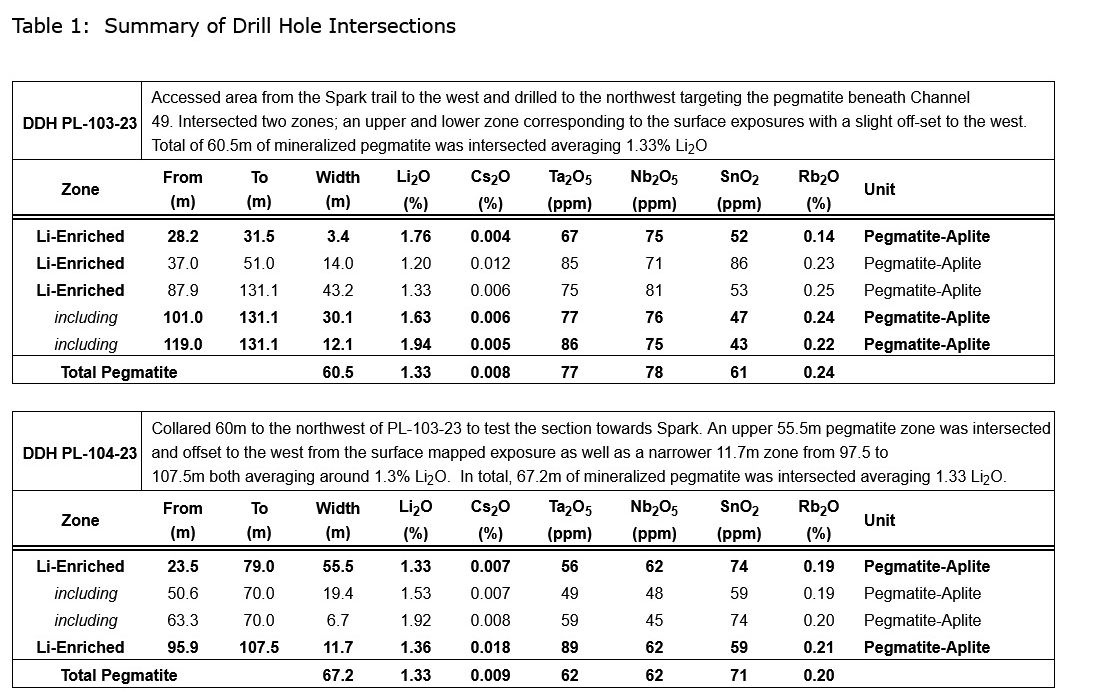 st, 2023, and has, to date, completed 2,629m in 11 drill holes. The first hole, DDH PL-103-23, was designed to test the presence of mineralized pegmatite beneath the northernmost surface channel while PL-104-23 stepped out 60m along strike to the northwest towards the Spark deposit. Results from these first two diamond drill holes have been received and highlights are included below: