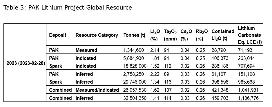 Table 3 is a summary of the current Mineral Resource Estimate for the PAK Lithium project.