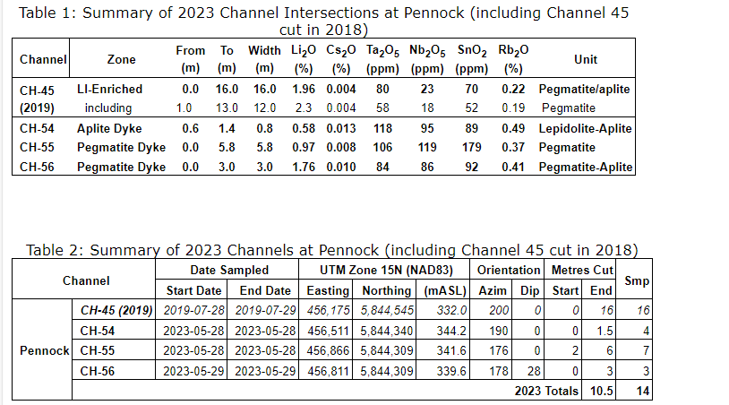As part of the 2023 summer drill program at PAK, exploration crews were mobilized to the Pennock area for follow-up to the 2022 mapping and prospecting to complete sampling along three channel cuts. This resulted in the discovery of several additional pegmatite/aplite dykes, many of which were channelled. The pegmatite dikes near channels 55 and 56 had been chip sampled in the past when spodumene had been identified. The channelling has now confirmed the presence of both spodumene and high grades of lithium oxide. Although spodumene was not visibly identified in the lepidolite-bearing aplite at channel 54, it was channelled to determine the Li2O content and for further study.