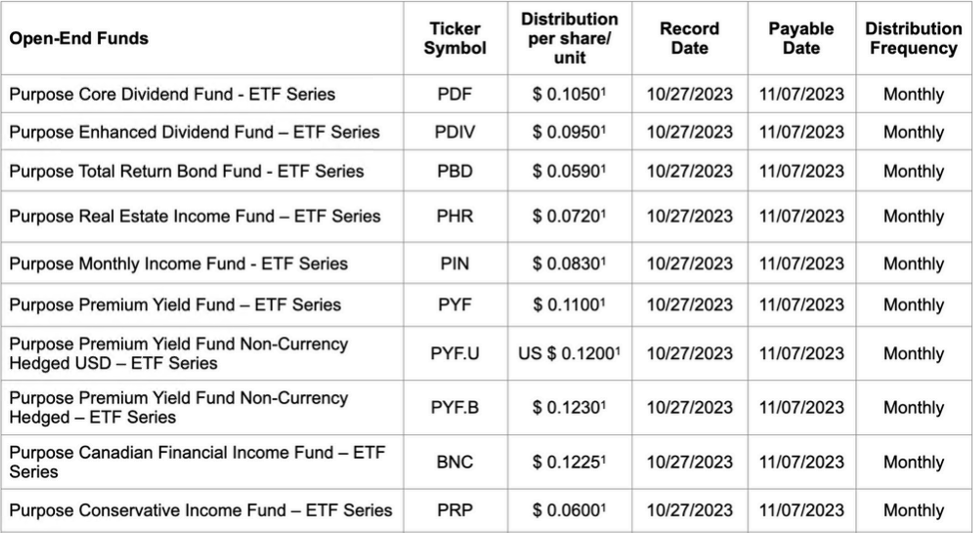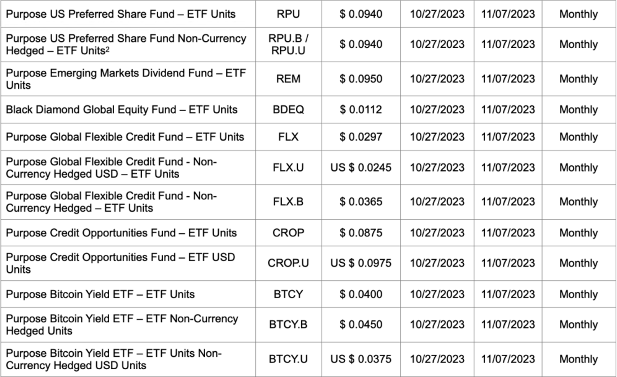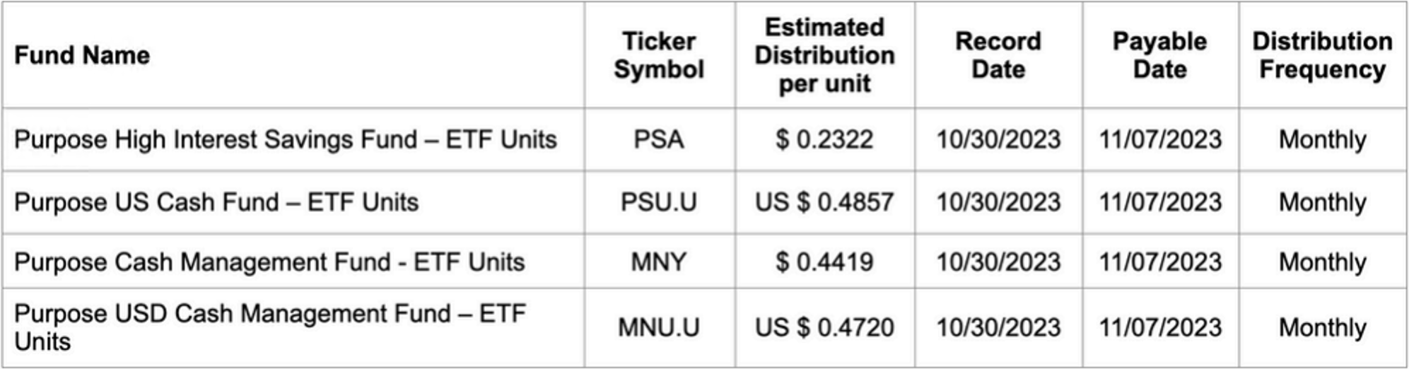 The ex distribution date for all ETFs is Oct. 26, 2023, with the exceptions of Purpose Bitcoin Yield ETF and Purpose Ether Yield ETF, which will have an ex distribution date of Oct. 27, 2023, as well as Purpose High Interest Savings Fund, Purpose U.S. Cash Fund, Purpose Cash Management Fund and Purpose USD Cash Management Fund, which have an ex distribution date of Oct. 30, 2023. The ex distribution date for all closed-end funds is Oct. 30, 2023.