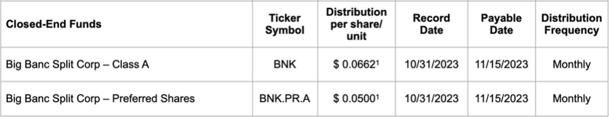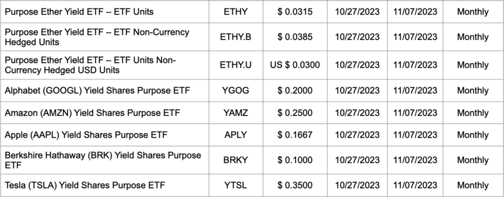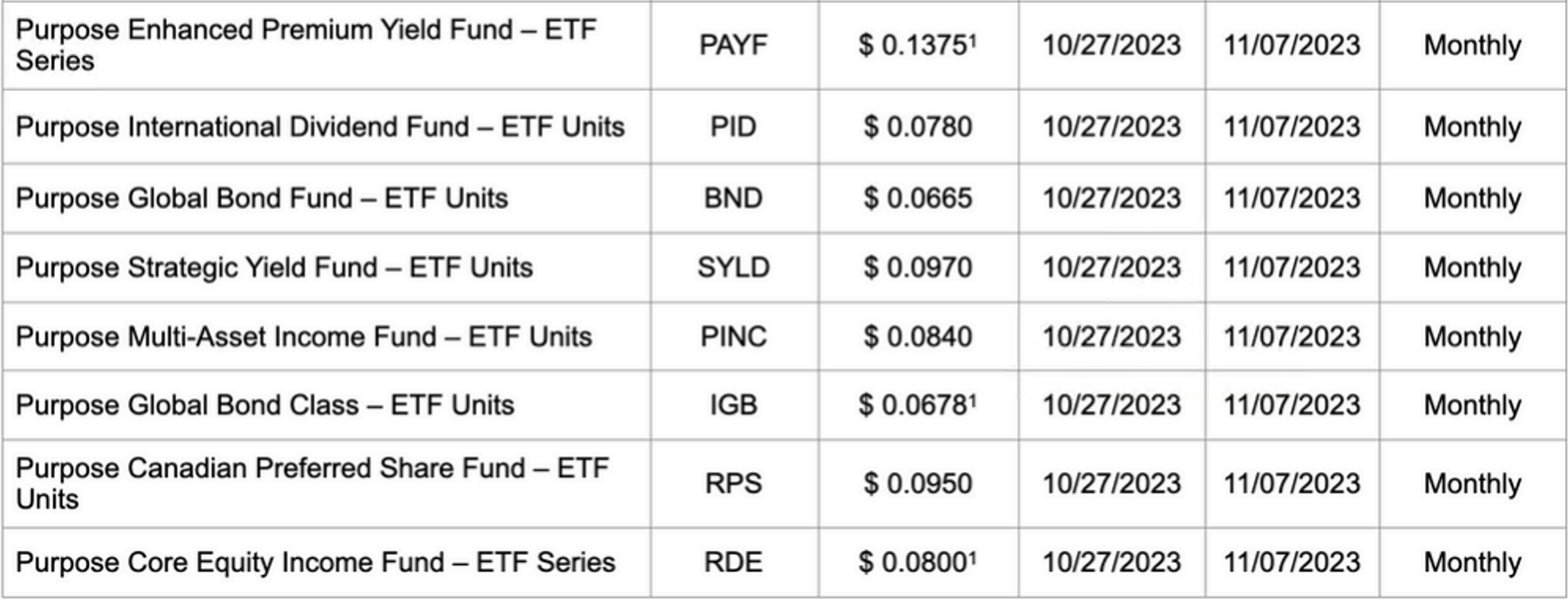 The ex distribution date for all ETFs is Oct. 26, 2023, with the exceptions of Purpose Bitcoin Yield ETF and Purpose Ether Yield ETF, which will have an ex distribution date of Oct. 27, 2023, as well as Purpose High Interest Savings Fund, Purpose U.S. Cash Fund, Purpose Cash Management Fund and Purpose USD Cash Management Fund, which have an ex distribution date of Oct. 30, 2023. The ex distribution date for all closed-end funds is Oct. 30, 2023.