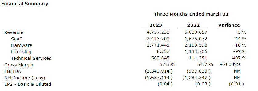 Revenue decreased by 5 per cent to $4,757,230 in Q1 2023 compared with Q1 2022, driven by growth in SaaS and technical services offset by decreases in hardware and licensing.