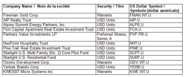 Further to the Toronto Stock Exchange staff notice No. 2017-0003 dated Sept. 5, 2017, all trades on Thursday, May 25, 2023, in the securities referred to in the attached table, which trade in U.S. dollars, will be for special settlement on Tuesday, May 30, 2023.