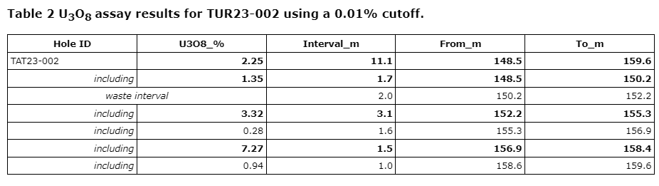 - TAT23-001 (Main zone) -- poor recovery in the mineralized zone did not yield material for assay. The downhole radiometric probe logged elevated radioactivity from 156 metres to 168 metres, with a high-grade zone from 163 metres to 166 metres (up to 36,000 cps (counts per second)).