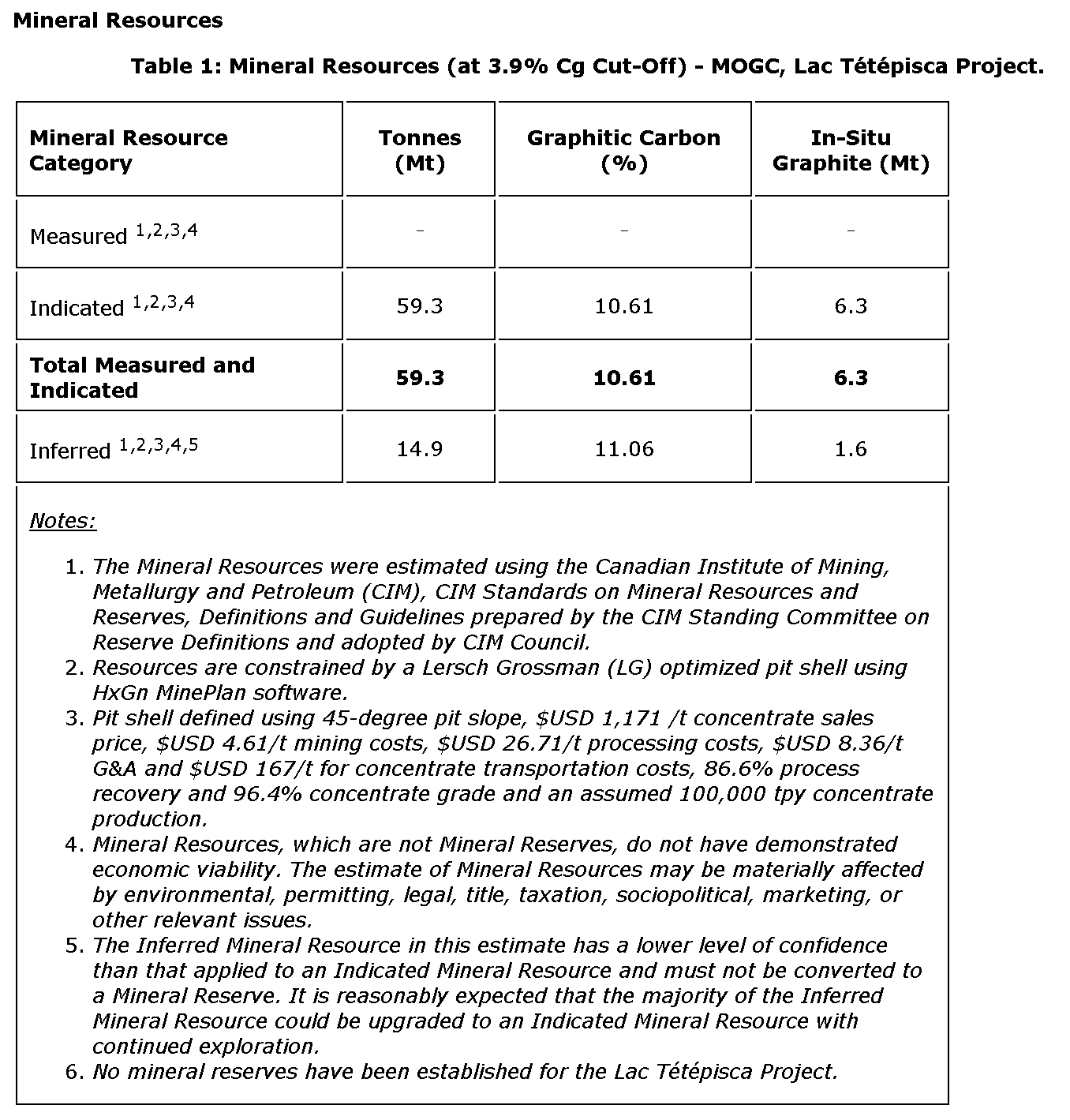The mineral resource estimate (MRE), prepared by DRA Global Ltd.'s (DRA) Montreal, Que., office, includes a pit-constrained indicated resource for the Manicouagan-Ouest graphitic corridor (MOGC) Lac Tetepisca project of 59.3 million tonnes (Mt) grading 10.61 per cent graphitic carbon (Cg) for an estimated content of 6.3 Mt of natural flake graphite (in situ) and an inferred resource of 14.9 Mt grading 11.06 per cent Cg for an estimated content of 1.6 Mt of natural flake graphite (in situ).