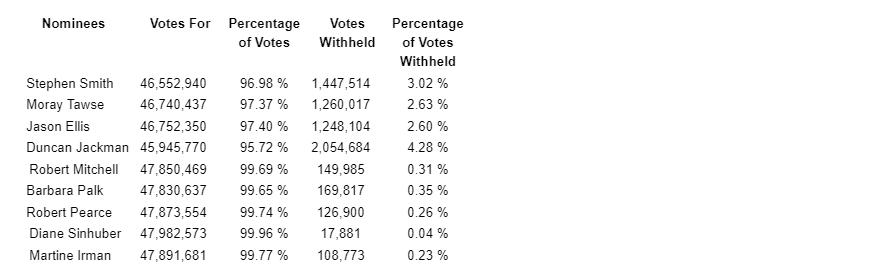 The results of the proxy vote for the election of directors are set out in the associated table.