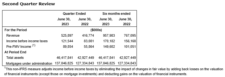 Earnings before income taxes and gains and losses on financial instruments ("Pre-FMV Income1"), which excludes the impact of these changes, increased 61% to $89.9 million from $55.9 million in the second quarter of 2022. This growth reflected the Company's success in growing MUA over many years. Higher servicing MUA creates higher mortgage administration revenues, and a larger portfolio of securitized mortgages provides five and 10-year income streams. Growth in commercial segment also contributed particularly with increased deferred placement fees.