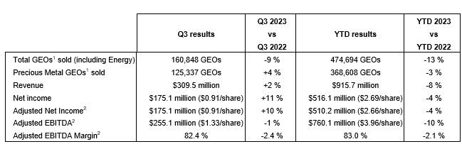 Precious metal assets: GEOs sold from Franco-Nevada's precious metal assets were 125,337, compared with 120,542 GEOs in Q3 2022, driven by strong contributions from Cobre Panama, Guadalupe-Palmarejo and MWS.