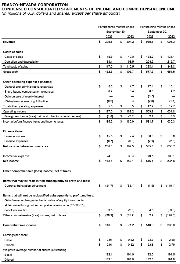 FRANCO-NEVADA REPORTS Q3 2023 RESULTS