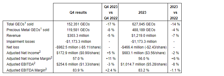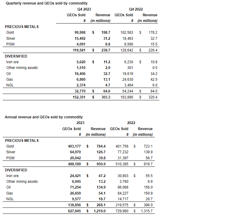 - Guadalupe-Palmarejo (50-per-cent gold stream) -- GEOs sold from Guadalupe-Palmarejo decreased in Q4 2023 compared with the same quarter in 2022 due to lower production at the mine. For 2024, the company anticipates gold deliveries to remain relatively consistent with those received in 2023, ranging between 32,500 and 37,500 GEOs.