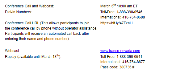 The company is pursuing legal avenues to protect its investment in Cobre Panama. The company has notified the Ministry of Commerce and Industries of Panama (MICI) of its intent to initiate arbitration pursuant to the Canada-Panama Free Trade Agreement. As announced to MICI, Franco-Nevada presently and preliminarily estimates its damages to be at least $5-billion, subject to further analysis and development.