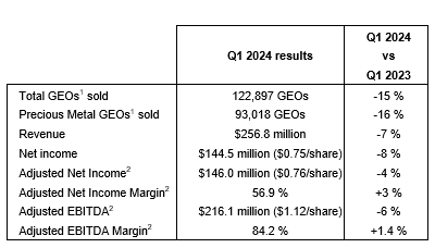 Guadalupe-Palmarejo (50-per-cent gold stream): GEOs sold from Guadalupe-Palmarejo increased in Q1 2024 compared with the same quarter in 2023, reflecting increased production at the mine due to better head grade and recoveries.
